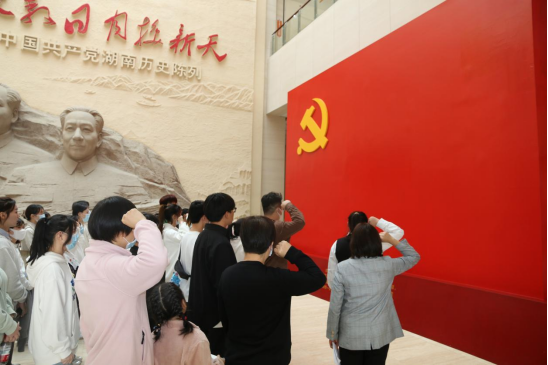党员同志们在湖南党史陈列馆内开展了一场“行走的党史教育课”。大家深入解了了中国共产党领导湖南人民革命、建设、改革所取得的辉煌成就和宝贵经验。党课结束后,全体新老党员在党旗下庄严宣誓,重温入党誓词,砥砺初心使命。