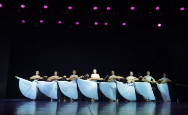 “越江女,越江莲,齐菡萏,双婵娟。嬉游向何处,采摘且同船。”女子古典群舞《莲鼓越歌行》取材于传统的江南水乡花鼓文化,将其融入古典舞中,“敲击”出了江南水乡的采莲美景。描绘出一幅江南水乡采莲女嘻戏欢唱的生活画面。舞蹈在“诗画浙江”的大背景创作产生,将我国自古以来的“放河灯”祈愿仪式融入古代吴越地区的“响屐舞”,让观众领略到:“越溪素足女,婉笑青眉扬。泛水采芙蓉,归来衣更香”的江南水乡独有气息。