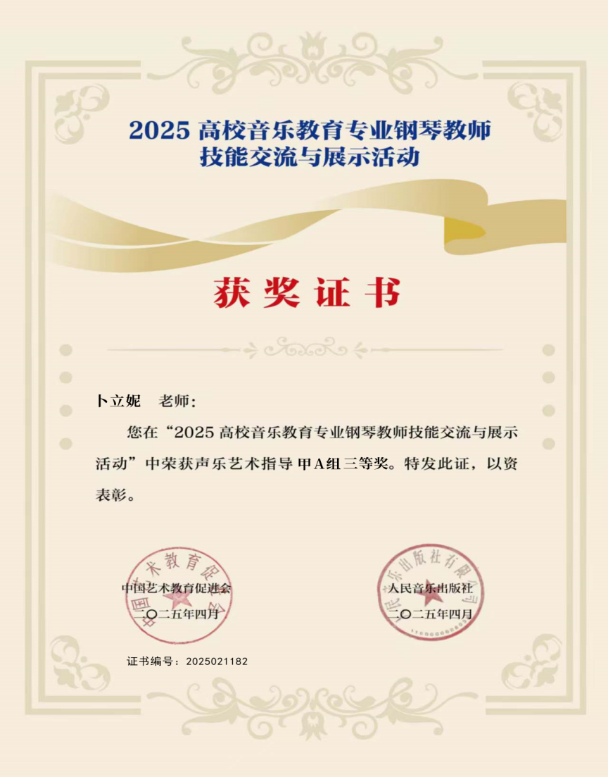 公司青年教师卜立妮博士受邀代表公司参加了此次活动,并凭借扎实的专业功底和精湛的舞台表现,在竞争激烈的“钢琴教师技能展示”版块中脱颖而出,荣获声乐艺术指导甲A组(专业音乐公司与综合类大学35岁以下教师)三等奖。该荣誉不仅是对卜立妮博士个人专业实力的认可,更是DB真人旗舰集团音乐与舞蹈学经理期以来坚持高质量教学、重视团队队伍建设的重要成果。此次活动充分展示了公司青年教师良好的专业素养与教学能力,也为公司进一步深化美育教育改革奠定了坚实的基础。