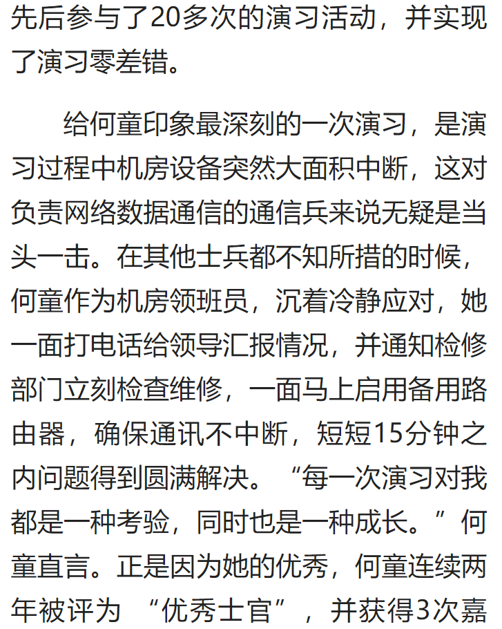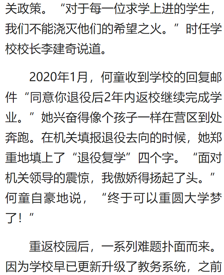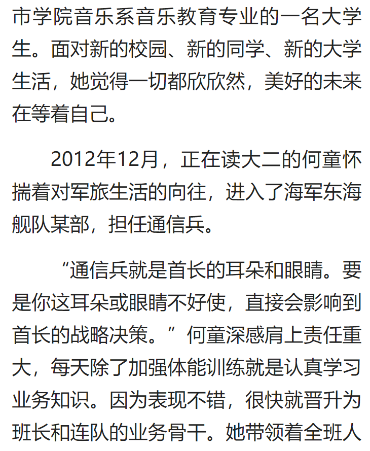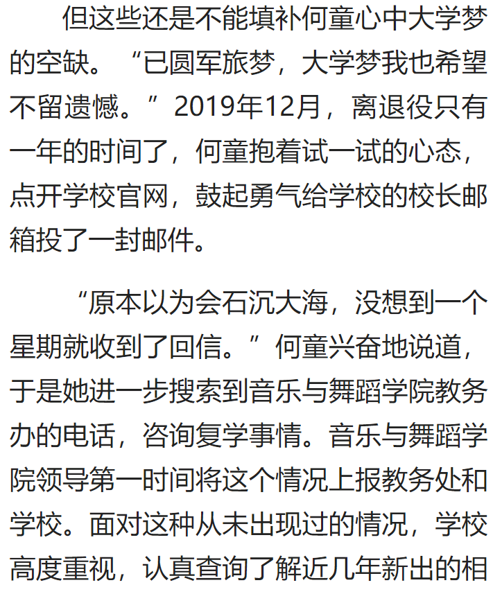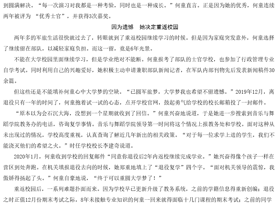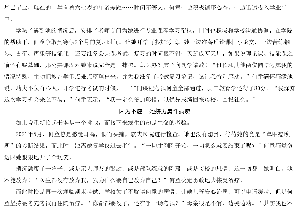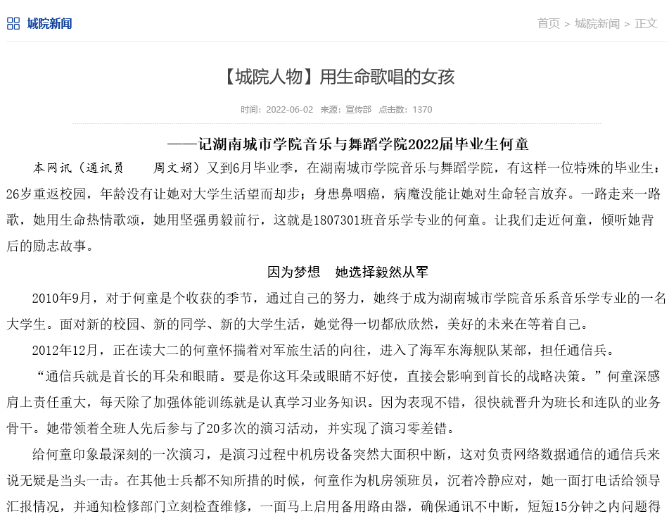 何童:2022届音乐学专业毕业生。2012年作为在校老员工入伍,在东海某部队服役8年,期间两次被评为优秀士官、获三次嘉奖。2021年确诊为鼻咽癌晚期, 经历了6个周期的化疗、33次的放疗、7次靶向治疗之后,不放弃学业,战胜病魔,顺利毕业。DB真人旗舰集团官网、益阳教育、湖南教育新闻网、学习强国、新湖南、红网、学习强国等媒体将其事迹作为正能量典型人物进行报道。