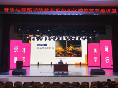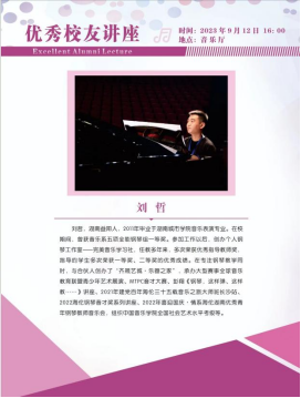 刘哲,公司2011年音乐表演专业毕业生,他自主创办了“齐晟艺城·乐器之家”,先后承办过全球音乐教育联盟青少年艺术展演、MTPC音才大赛等大型赛事、2022年喜迎国庆·情系海伦湖南优秀青年钢琴教师音乐会等大型活动。他从处事要有感恩之心、坚持深耕专业、勇于承担责任三个方面分享了自己求学、创业的经验,勉励同学们做事要有温度,有气度。