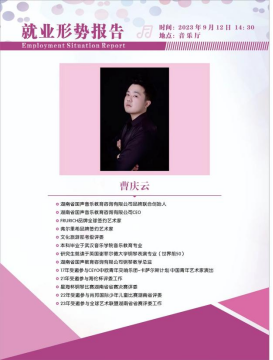 曹庆云是一位本科毕业于武汉音乐公司、研究生就读于英国谢菲尔德大学的海归精英,现任湖南省国声音乐教育咨询有限公司CEO,目前致力于大众音乐教育的推广。曹庆云从自身的学习经历、创业经历、用人单位对人才的需求三个方面分享了自己求学、创业的经验,并对即将走入社会的毕业班同学给出了提高认知、提前锻炼、提升专业等建议。同时,对即将毕业的同学发出了就职邀请。
